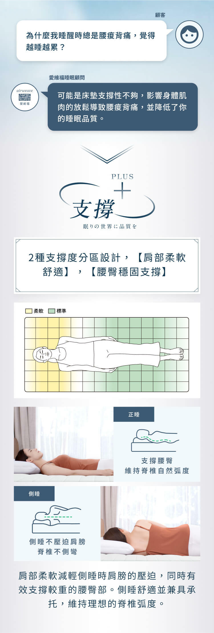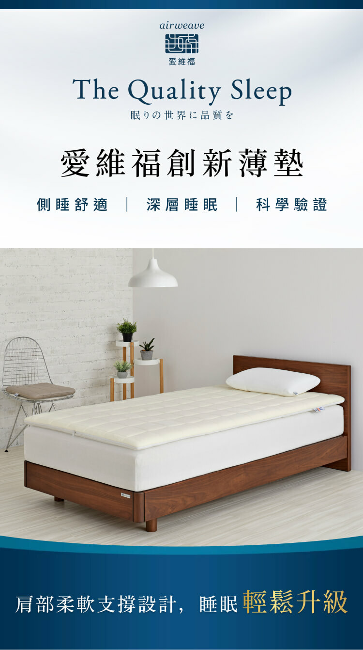 創新薄墊是愛維福薄墊系列中的經典款式,採用兩段式硬度設計,頭部、肩部較柔軟,讓習慣側躺的客人,在側躺時減低肩膀的壓迫感,提高舒適度。並且能減輕在翻身時的阻力,實現翻身不費力的特色。
