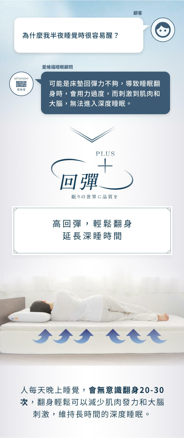 根據史丹福大學睡眠研究中心報告證實,輕鬆翻身,能讓體內核心溫度平穩下降,進而提升睡眠的品質。