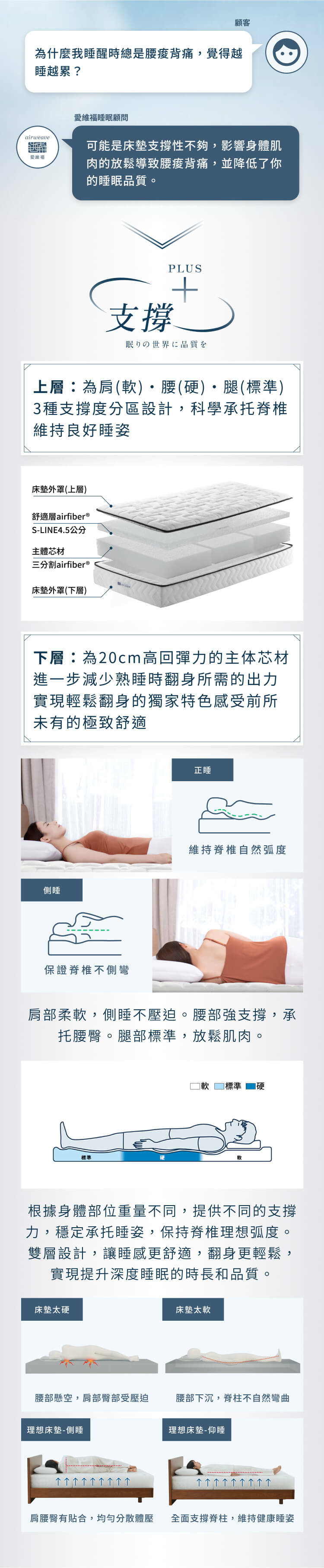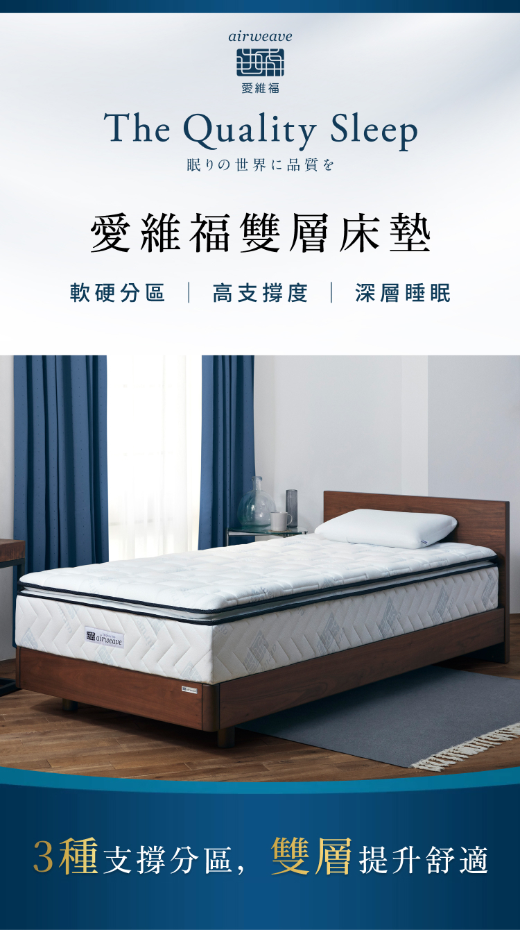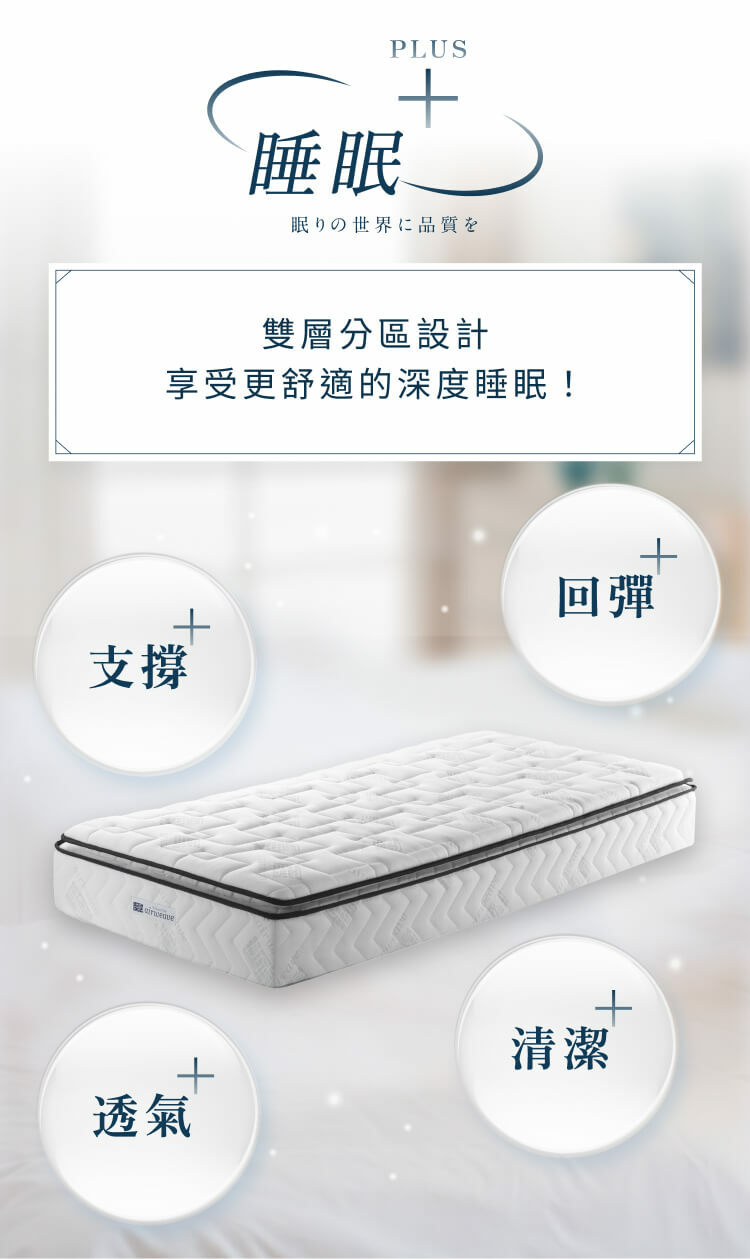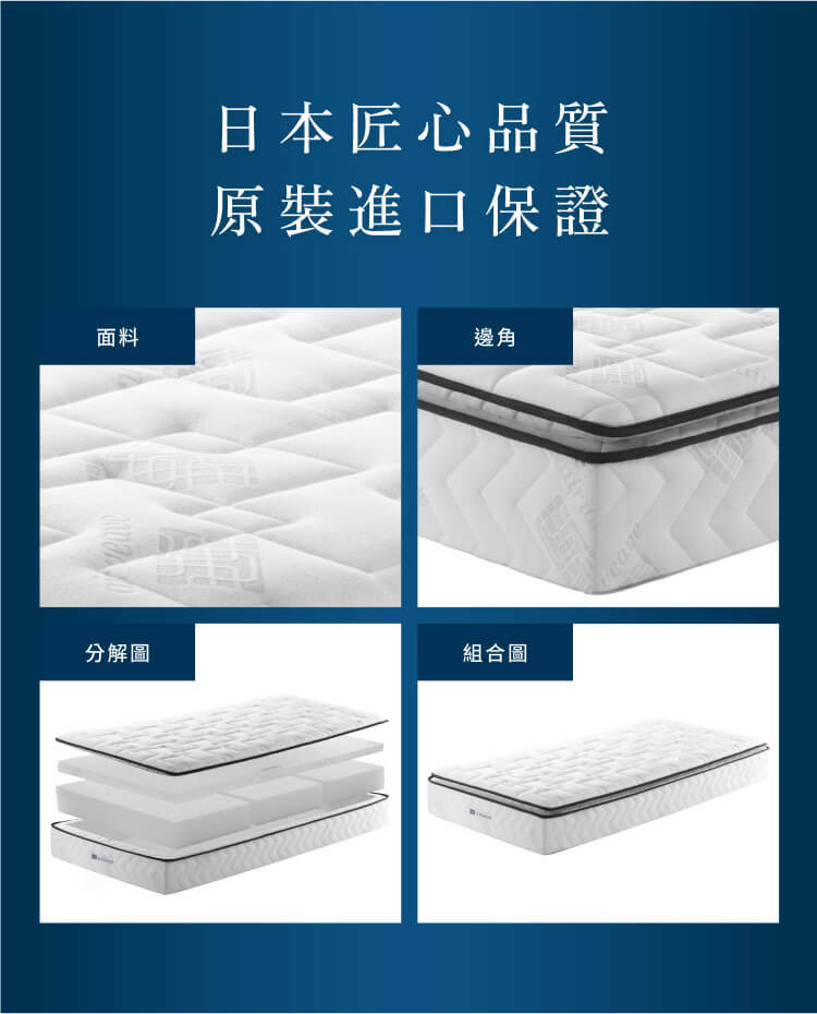 上層舒適層採三段式軟硬度設計,肩部柔軟、腰部支撐、腿部適中,