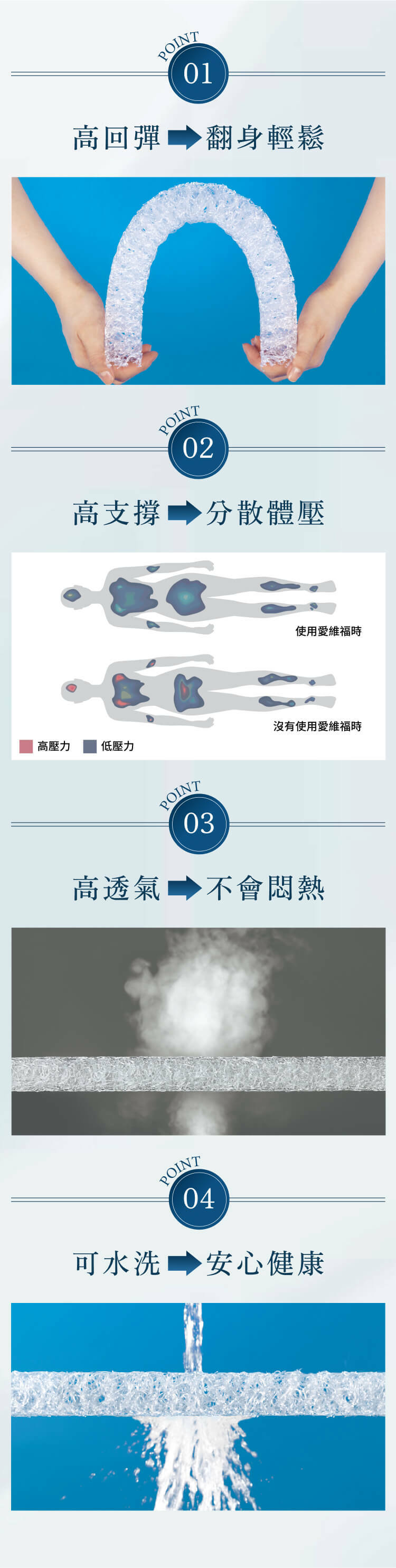 下層主體芯材的高回彈力,減少熟睡時翻身所需的出力,