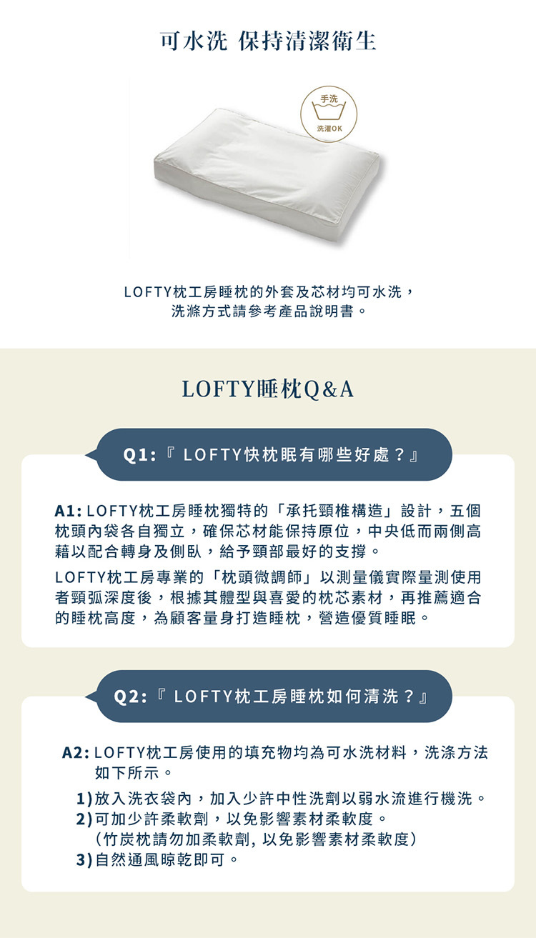 枕工房睡枕獨特的「承托頸椎構造」設計,五個枕頭內袋各自獨立,確保芯材能保持原位,中央低而兩側高,藉以配合轉身及側臥,給予頸部最好的支撐。