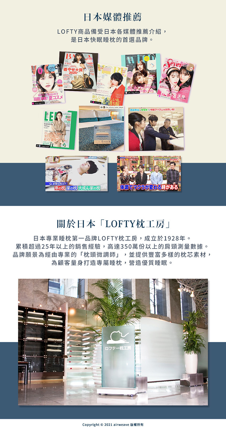 日本百年歷史枕頭專家「枕工房」,專業「枕頭微調師」以測量儀實際量測使用者頸弧深度後,根據其體型與喜愛的枕芯素材,再推薦適合的睡枕高度,為顧客量身打造睡枕,營造優質睡眠。