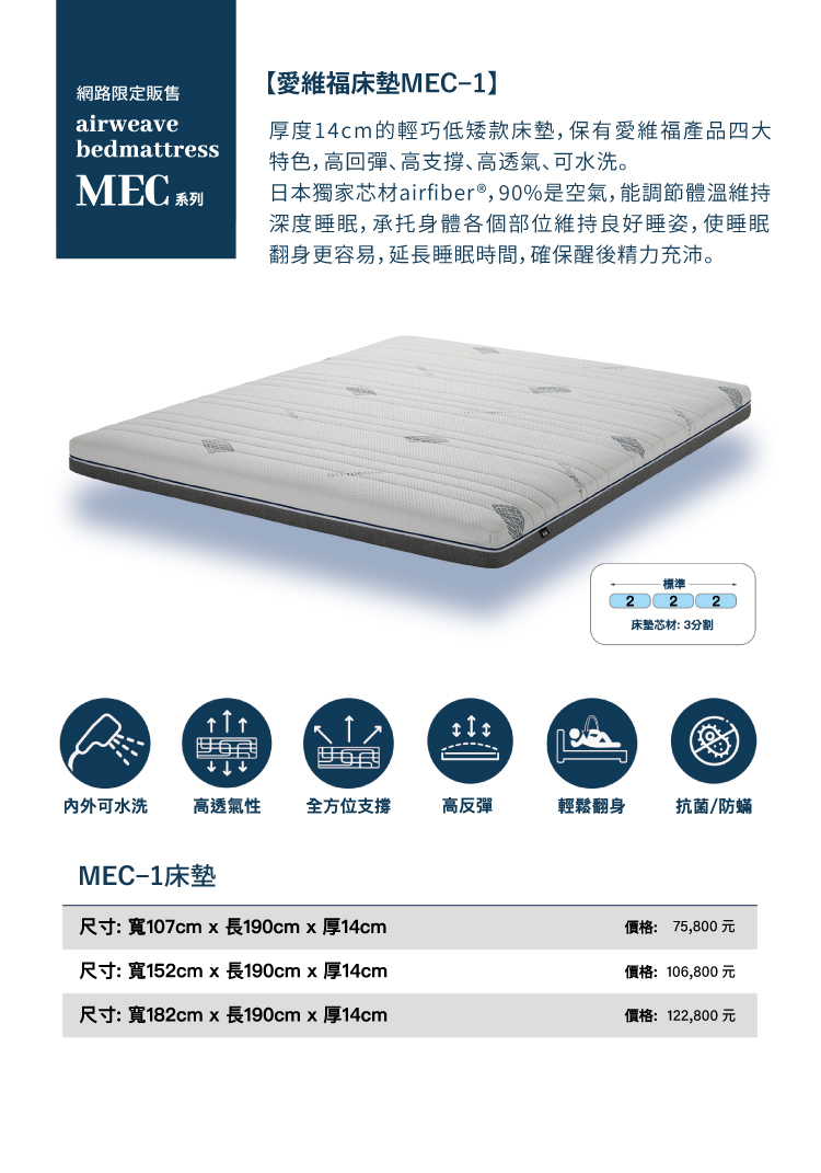 厚度14cm的輕巧低矮款床墊,保有愛維福產品四大特色,高回彈、高支撐、高透氣、可水洗。