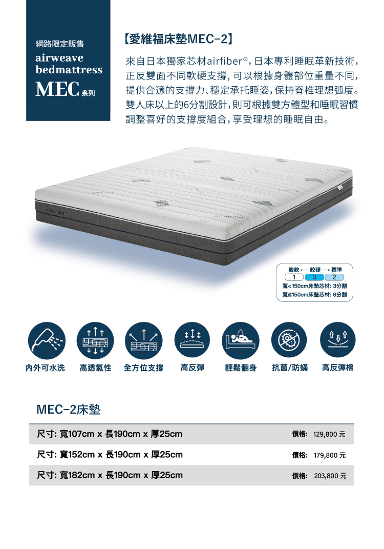 來自日本獨家芯材airfiber®,日本專利睡眠革新技術,正反雙面不同軟硬支撐,可以根據身體部位重量不同,提供合適的支撐力、穩定承托睡姿,保持脊椎理想弧度。雙人床以上的6分割設計,則可根據雙方體型和睡眠習慣調整喜好的支撐度組合,享受理想的睡眠自由。